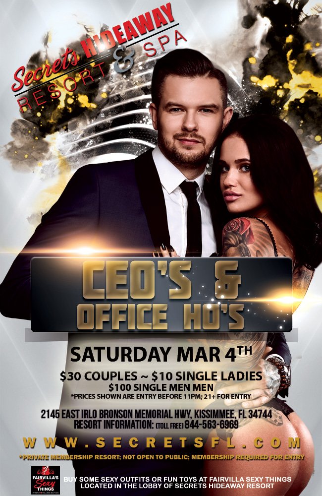 Secrets Events is truly "in business" this Saturday as we bring the madness you know and love! This will not just be another day at the office folks. The theme is quite obvious but if you didn't get the memo we want guys to show up in business attire (dress for success fellas) ties are strongly encouraged! If you don't own a tie BUY ONE, if you can't tie one, get a clip on!! lol Ladies come in your sexiest attire, bring your A game and be the hottest "sexitary" you can be.
