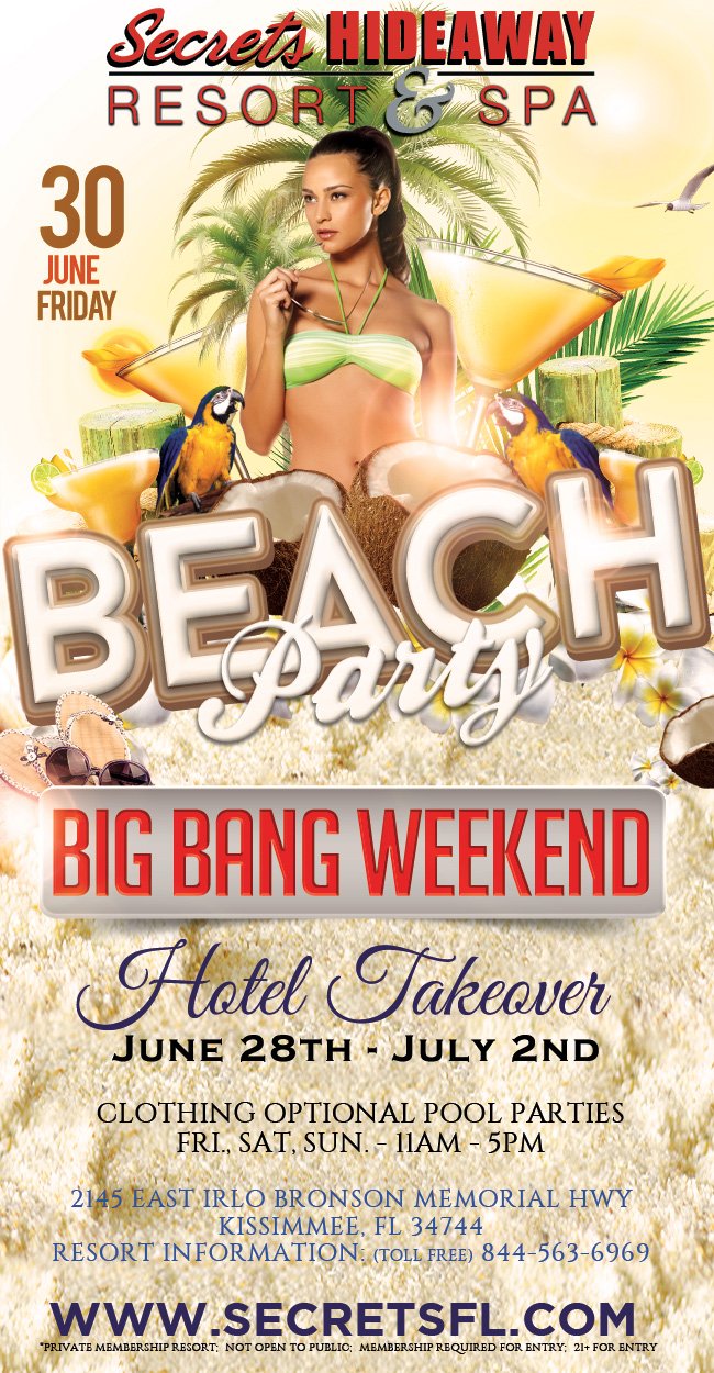 Welcome Summer!! Oh how we have missed you. On June 28th through July 2nd Secrets Hideaway is pleased to bring you our Fourth Annual Big Bang Weekend. Come celebrate your independence with clothing optional pool parties, naked volleyball, and nightly parties!! Club Secret opens every night at 7:30 as well as our complimentary dinner buffet.