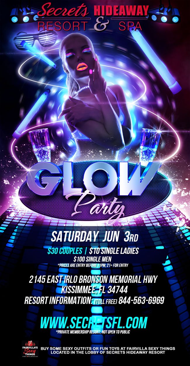 Are YOU ready to stand out? Our black light parties combine our premium nightclub experience with an added visual element. Join Secrets Hideaway for one of our best themed parties. That's right our fantastic GLOW Party!!! Secrets Hideaway is hosting a unique party that fuses together music, special effects, hot people and glowing colors. Step into a mind blowing combination which creates interaction, excitement and enjoyment from start to finish. Our spectacular party has a dramatic impact on the crowd, as they go absolutely crazy!!!! Our black light parties get BIGGER every time we throw one! Escape into an immersive environment of GLOW imagery. Ladies and gentlemen we want you to wear as much florescent swag as physically possible. Feel free to bring any glow materials you have to this outstanding event.