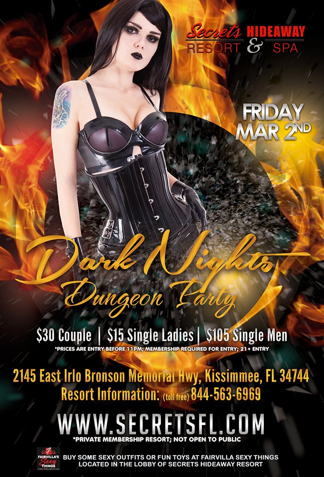 Have a secret??? Have a fetish??? Come to Secrets Hideaway tonight and share your deepest, darkest fantasy as we share our lighter side of Kink. Saturday is on fire as our Dark Nights Dungeon Party is kicking up ashes. Come dressed for a Kinky night as we celebrate our Kinkster and Swing Lifestyles coming together for a Hot night. Lots of demonstrations both in the Dungeon and Club Secret, don't miss your chance to be tied up or enjoy a bit of a brush with the BDSM side of Spice.