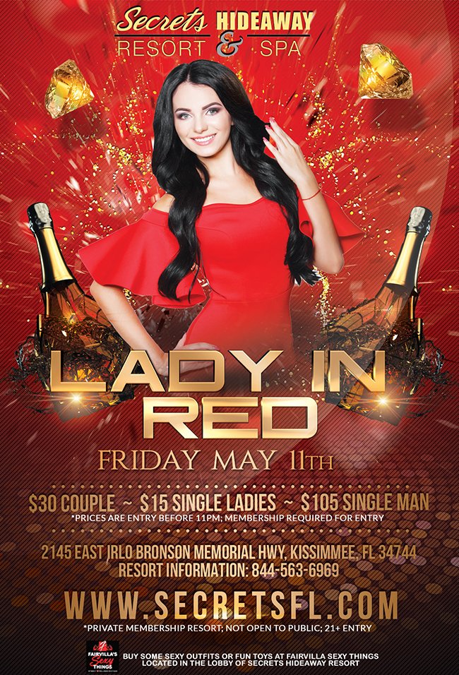 Sensual, Slinky, Sassy and yes Sexy. Every lady has something in Red, and tonight at Secrets Hideaway it’s time to show it off for our Lady in Red party. Don’t worry about digging through your closet for something to wear, dare to bare some leg in sensual red and come out for a night of sexy fun! Guys don’t forget you can wear red too. Imagine watching your sexy lady shimmy on the dance floor. Any way you look at it Red is simply HOT!!! Whether it’s something low cut, a micro mini or some tantalizing lingerie, we want to see how sexy you can wear Red.