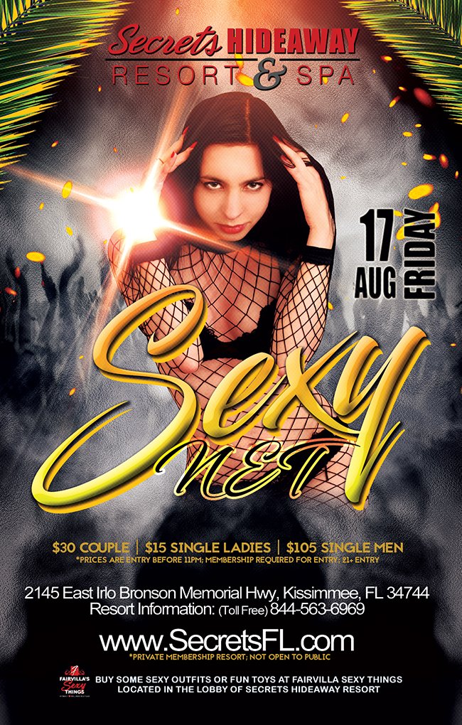 Are you ready as Secrets Hideaway throws ONE of its Sexiest parties… our Sexy Net Party! We encourage the ladies to dress as sexy as they want in Net and more. This party is about SKIN and all the sexiest fabrics we can see on your bodies. Net wear is fun whether it’s on your legs or wrapped around your body in a sexy dress or top. Fishnets are always sexy, but tonight with all of the ladies running around in barely there “clothing”, it’s going to get HOT fast! This is the event to let it all hang out.