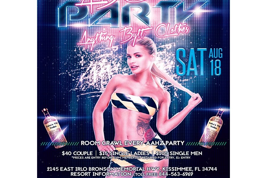 That's Anything But Clothes Party. Come on people let’s get and be creative with your outfits for this event. Anything you want to wear that is not clothing Wear IT!. It’s Anything BUT Clothes. Try Body Paint or Saran Wrap, Caution Tape, bubble wrap etc. The fun part is taking it all off at the end of the night. Men you are allowed to take part is this theme. We here at the Aahz Party have been doing this theme for over 15 years and no other party has the hottest couples in theme than Aahz.