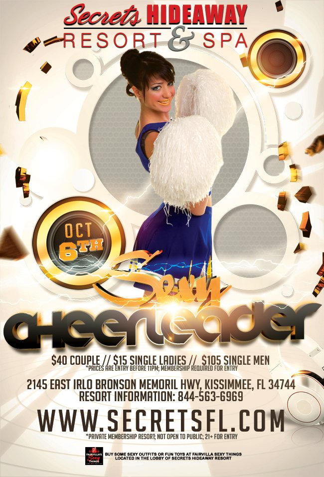 Give me an S! Give me an E! Give me a C! Give me an R! Give me an E! Give me a T! Give me an S! What’s that spell? SECRETS!!!! Show your team spirit tonight at Secrets Hideaway with our Sexy Cheerleader Party. Whether you like football, baseball, basketball or hockey, we all love the sexy cheerleaders. Ladies, you can make it even sexier with pony tails and knee-high socks. Guys, drive the girls wild by bringing out your inner stud.