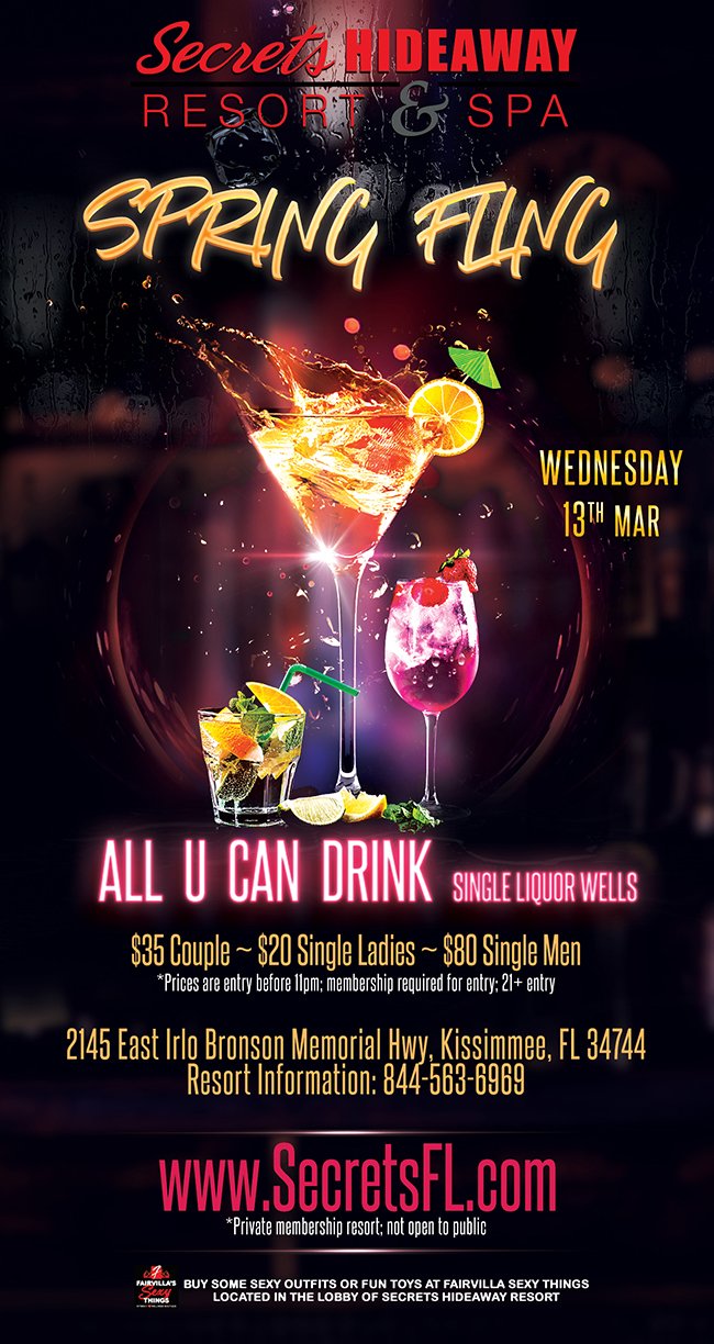Only $35 for Couples, $20 for Single Ladies, and $80 for Single Men takes care of club admission, access to the pools, spas, and playrooms, and even keeps the drinks flowing all night long! Secrets Hideaway Resort and Spa is the sexiest place to be on Wednesday nights, and is the only place to be for Spring Fling Takeover 2019!