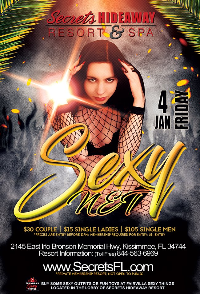 Nothing but net for this sexy evening at Secrets Hideaway Resort and Spa! Fishnets, netted shirts, netted boxers… we want to see all it all. Join your sexiest friends in your peek-a-boo netting as you dance the night away in our 3000sq ft club, Club Secret. The DJ will be playing the hottest dance music and the bartenders will be pouring the coldest drinks. With 5 stripper poles, 2 bars, plenty of comfy couches and a professional light system, we have everything you need to make your wildest fantasies come true!