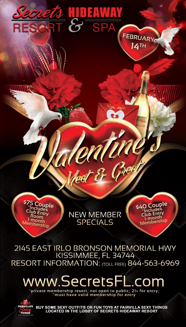 For only $40 per couple, you’ll receive a one-month membership to Secrets Hideaway Resort and Spa, plus club entry to the hottest newbie night in the industry. Really ready to escape the mundane? Stay the night with us in one of our rooms for only $75. We’ve got your entire night covered with our complimentary dinner buffet, starting at 6pm, and two pool-side bars. Grab a few new accessories at our on-site boutique, Fairavilla’s Sexy Things, and take a dip in one of our two clothing-optional pools, or meet new friends in one of our indulgent hot tubs. Then, get ready to party in the recently updated Club Secret, complete with large dance floor, 5 stripper poles, comfy couches, and the most popular dance music. Really ready to explore the lifestyle? We offer multiple indoor playrooms where you can put on a show, meet new couples, visit our dungeon, and create your wildest fantasy! So, what are you waiting for? Join us on Thursday nights and get ready to create some secrets of your very own!