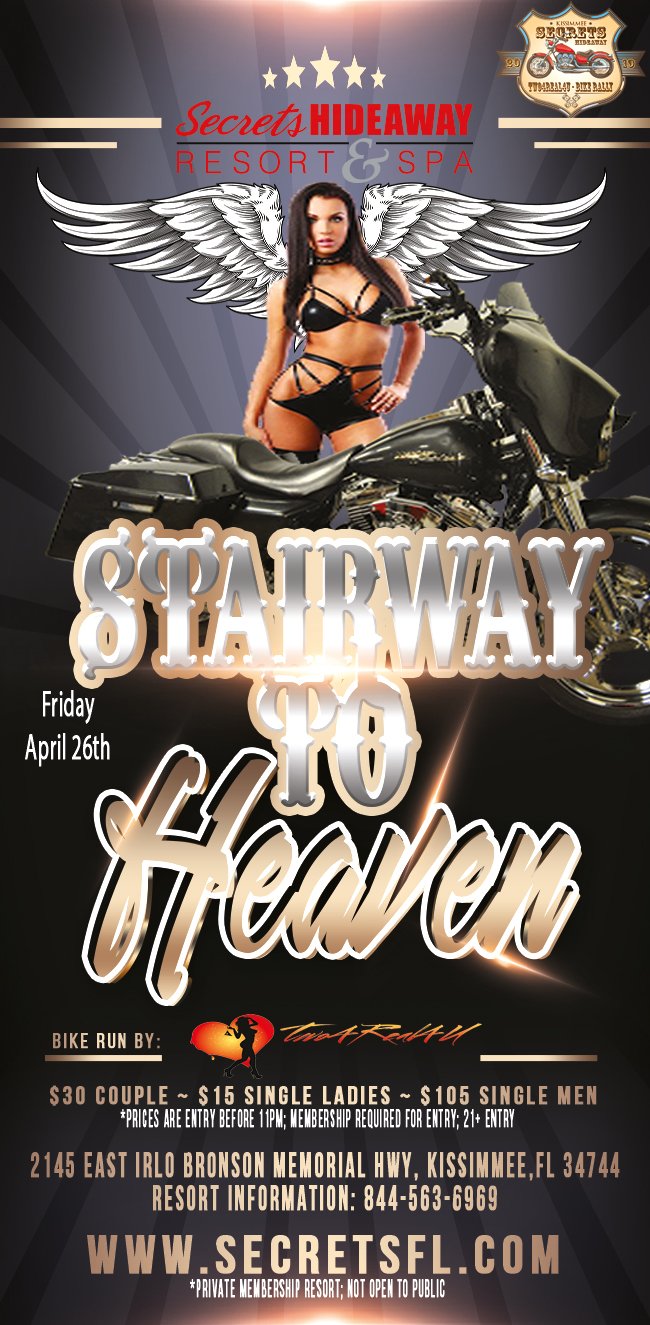 7:30PM Stairway to Heaven Party inside Club Secret - Let’s make it sexy tonight and see all our hot biker babes in their sexy lingerie. (Get to the club by 8:30PM to learn the Biker Shuffle with Robert & Christina)