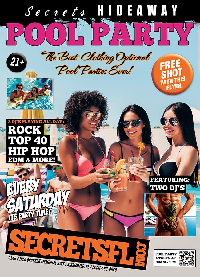 Celebrate Saturday in the sexiest way possible at Secrets Hideaway’s clothing-optional pool party! The weather is hot, so come strip down and cool off poolside. Join all of your sexiest friends at Secrets Hideaway Resort and Spa for a day in the sun, drink in hand, hot music, and even hotter friends. Our courtyard pool area and two outdoor tiki bars are the perfect location to let loose, be free, and celebrate summer!