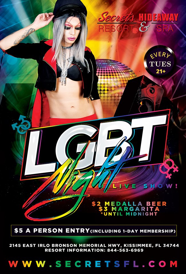LGBT Night EVERY TUESDAY. Join us and enjoy this electrically charged night with the stunningly energetic and beautiful performers with their super-hot Drag Show. This night will be filled with erotic music, dancing, and our DJ will be spinning today’s top hits. We will have $2 Medalla Beer, $3 shots, and $3 margaritas until Midnight.