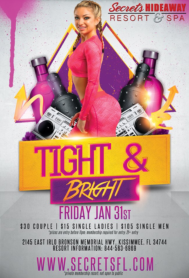 Tight & Bright are perfect for tonight as we wrap up two of our favorite trends into one extremely sexy party! Join us at Secrets Hideaway Resort and Spa for a radiantly revealing night of fabulous fun! Meet your friends at Club Secret as the dance floor transforms into a dazzling sea of vivid sensuality. Our DJs are ready to spin the hottest music and our bartenders will keep the drinks flowing all night long. We’ve set the scene and we are ready to play, so grab your friends and get ready to make some sexy secrets you won’t soon forget!