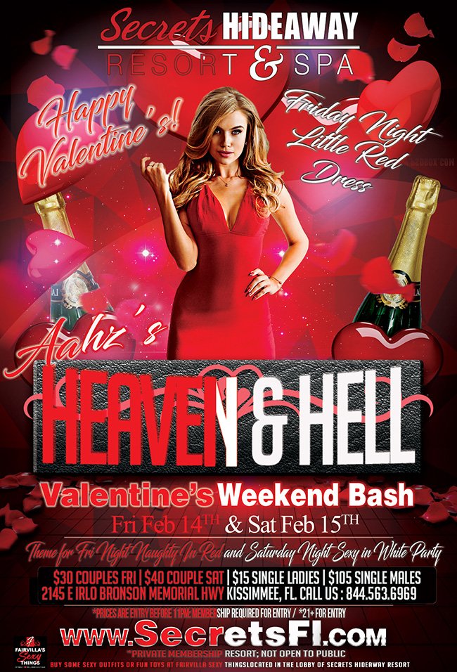 Join Aahz Party and kick off a weekend of passion and play as Heaven & Hell descends on Secrets Hideaway Resort and Spa. It’s Valentine’s Day and Aahz Party is brining you a celebration of all that is Naughty in Red! Wear your most playful & mischievous red for a sinful night of heavenly desires. Tease your partner & entice your playmates because tonight we take romance beyond the greeting cards as all your most alluring Aahz friends come out to play.