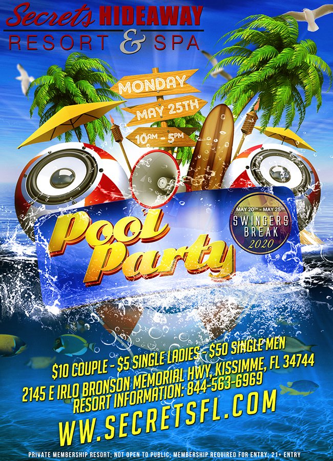 Welcome to the hottest Memorial Day Clothing-Optional Pool Party anywhere!  So grab your spouse, your friends, and your playmates too and get ready to dance away the afternoon! Our professional DJ will keep you energized all day long, as you sip on tropical cocktails from our tiki bar and enjoy the company of like-minded friends in our safe and private courtyard oasis. With multiple pools & spas, plenty of space to stretch out and even VIP cabanas available for reservation, Secrets Hideaway is the only place to spend your Swingers Break!