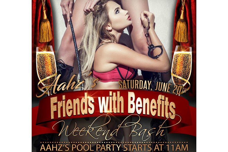 The party starts at 6:00pm with the famous Aahz room crawl, so get to the resort early! Your sexy host couples will be waiting with custom shots for you to enjoy and many new friends to meet. Club Secret opens at 7:30pm so grab a bite and get ready for a night of benefits like no other. With a huge dance floor, fully-equipped BDSM Dungeon and ample playrooms, you never know where the night may take you. The group shower is the perfect cool down after getting hot and sweaty, or get wet in one of our lavish hot tubs. The amenities are open until 4 am and there’s plenty of time to make new friends as Aahz Parties celebrates the ultimate friendships - Friends with Benefits!