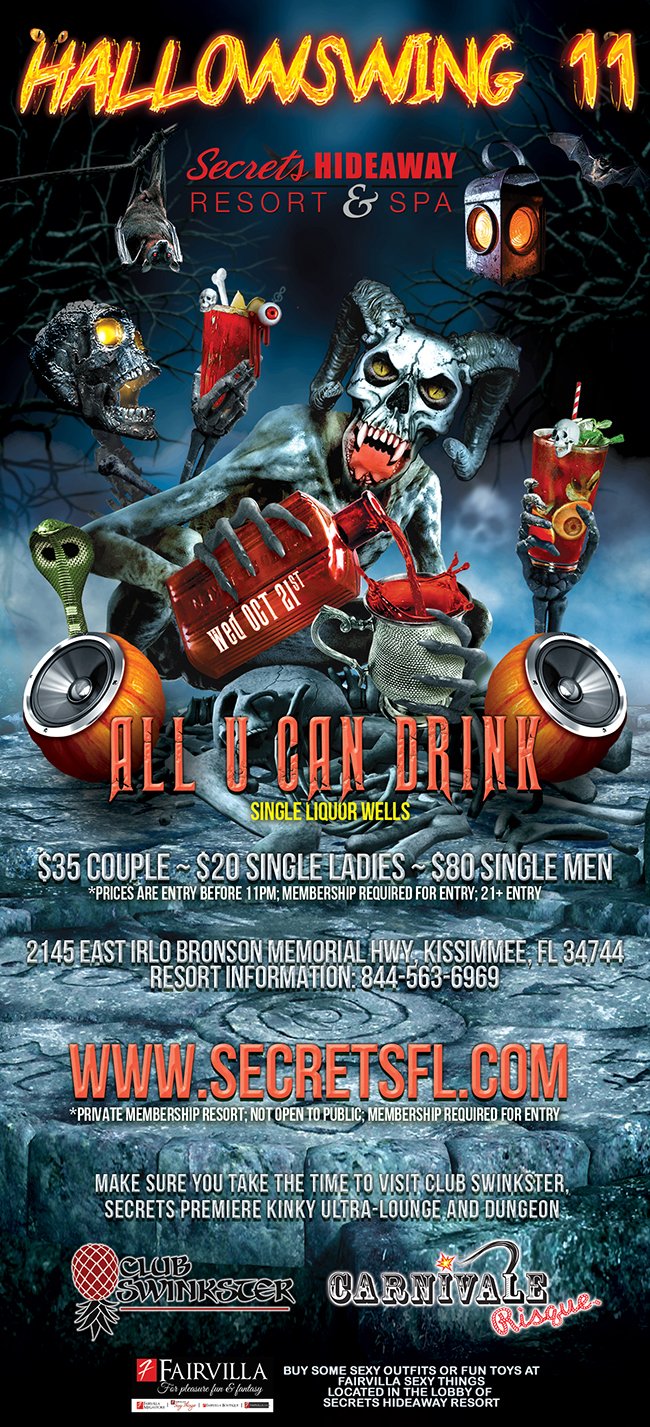 Only $35 for Couples, $20 for Single Ladies, and $80 for Single Men takes care of club admission, access to the pools, spas, and playrooms, and even keeps the drinks flowing all night long! Lounge by the pool, mingle with monsters by the tiki bar, or sink your teeth into a bite to eat from our Lunch and Dinner menu. Soothe your hunger then get ready for the party to start as Club Secret and the playrooms open at 7:30pm. Secrets Hideaway Resort and Spa is the sexiest place to be on Wednesday nights, and is the only place to be as we celebrate HallowSwing 11!!