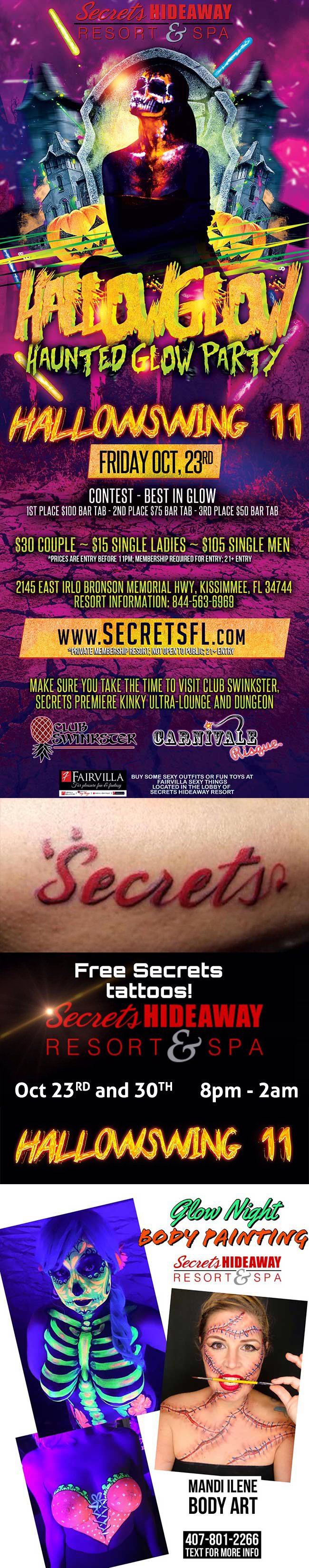 Ghastly ghosts come out to play and haunt the night at Secrets Hideaway. Poltergeist with glowing eyes summon the demons, it’s time to rise! Adorn your vessel, choose your disguise, glowing bodies ready to surprise, ready for mischief, ready to hunt unsuspecting mortals just looking for fun. Come revel with phantoms, devils, and ghouls it’s HallowSwing 11, and we make our own rules!