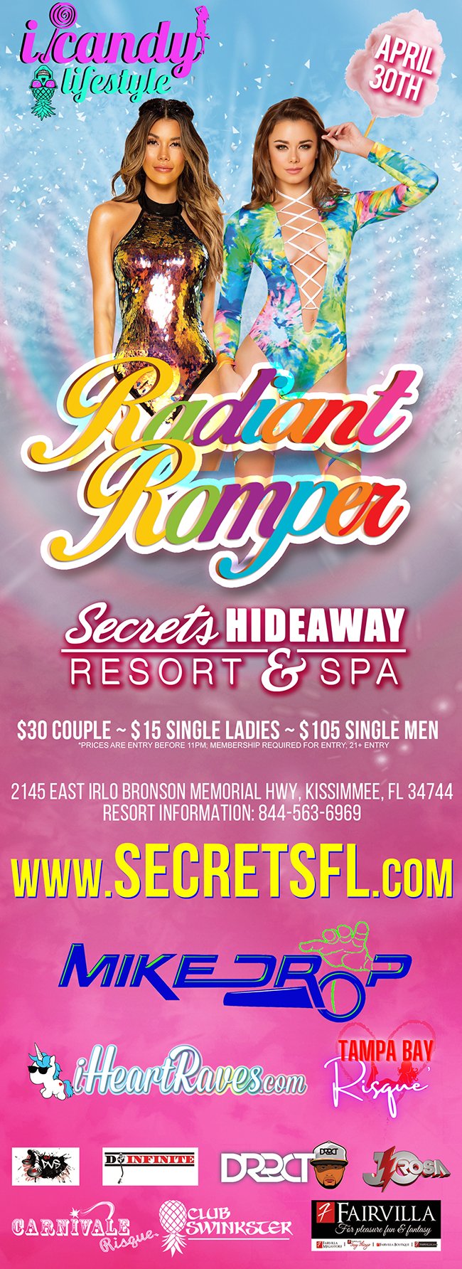 Let your radiance shine and let your outfit do the talking. What better way to start your Rave weekend than to show off your sexiest one piece Radiant Romper? Join i.Candy Parties as we take you on this colorful rainbow journey! With a huge dance floor, two bars, plenty of VIP seating, and Special Guest DJ Mike Drop spinning , Club Secret and i.Candy are the perfect way to start your weekend off with a bang!