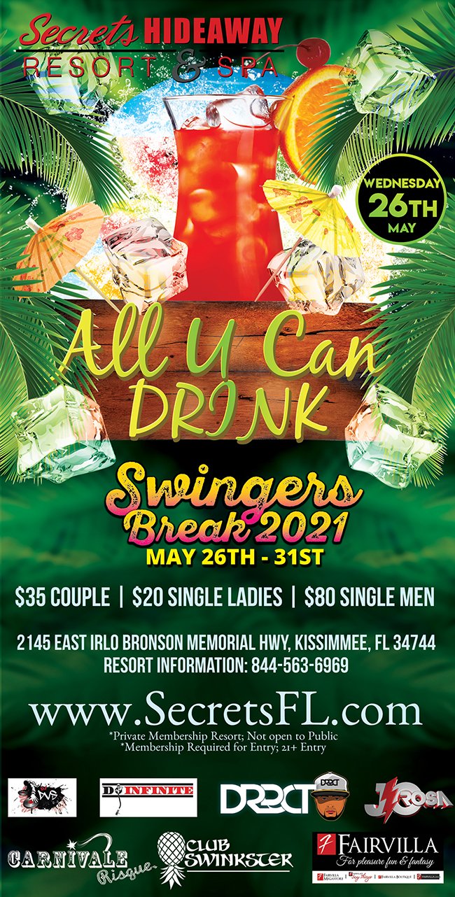 Who says that summer break is just for kids? Adults need playtime too and our fun has no limits. So, pack your bags and get ready for 6 days of Swingers Break, only at Secrets Hideaway Resort and Spa in beautiful Kissimmee, Florida!