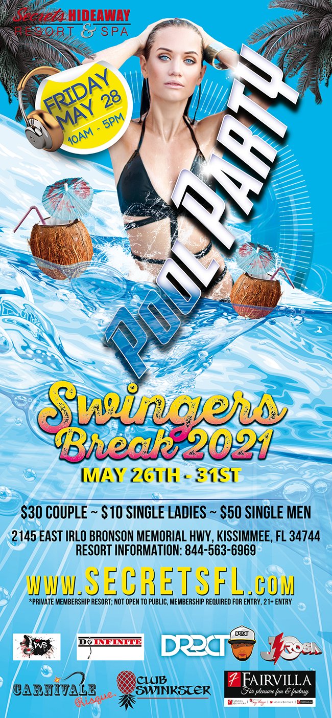 Join us at Secrets Hideaway Resort & Spa and kick off Memorial Weekend at Orlando’s hottest clothing-optional pool party! Why should kids have all the summer-break fun? We deserve to play too, so starting at 10am Secrets is ready with cold drinks at our two tiki bars, yummy lunch and snack menu items, and a professional DJ to play all your favorite songs. Pool-side games, FREE SHOTS, and plenty of naughty fun ensure that this is one wild weekend event you don’t want to miss! It’s time for fun in the sun with all your Secrets friends as we take on Swinger Break 2020!