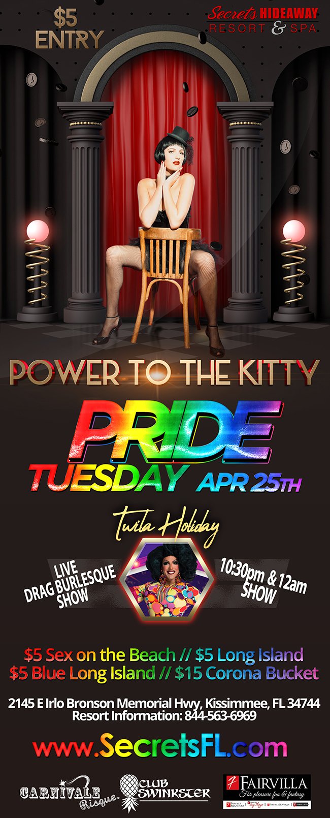 This kitty has claws but let’s be honest she likes to play. Showing power to the lesbian community with a night of lace and paste for those who like to chase. Beautiful Burlesque style entertainment with special guest performances and sexy eye candy to keep the party going. Strap on some kitty ears and Show us how you Burlesque. Show starts at 10:30 pm. The night will be filled with erotic music, dancing, and DJ Rosa will be spinning today’s top hits. We will have $5 Sex on the beach, $5 Long Island, $5 Blue Long Island, and $15 Corona Buckets all night long.