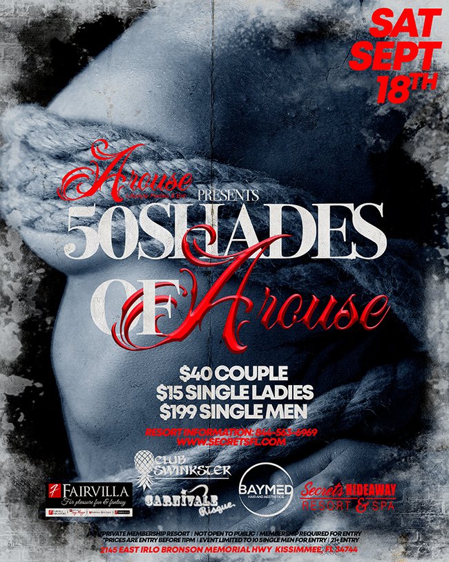Arouse Lifestyle Parties & Entertainment brings what is sure to be the most erotic party of the year The 50 Shades of Arouse Party! Start off your day with The Arouse Poolside Foam Party and enjoy some Florida sunshine, adult beverages and sexy fun and games! Then it’s time to unleash your inner erotic side for the 50 Shade of Arouse Party starting with entertainment on the outdoor stage and finishing off in Cub Secret dancing the night away!