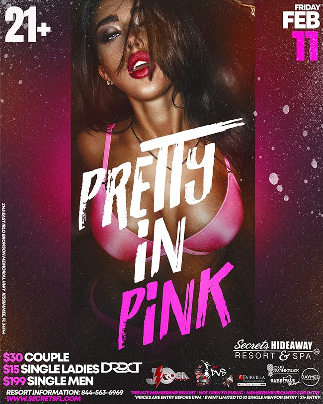 Get ready to tantalize your senses tonight as Club Secret® presents Pretty in Pink. Ladies, you know we love to drive the guys wild, so why not start our weekend off right by showing a little pink? Sexy dress, steamy lingerie, or even pasties - if it’s pink, we want you to wear it! And gentlemen, we haven’t forgotten about you! Pink looks good on us all, so let’s see you glam it up for this one-of-a-kind Valentine’s Bash that goes all weekend long!