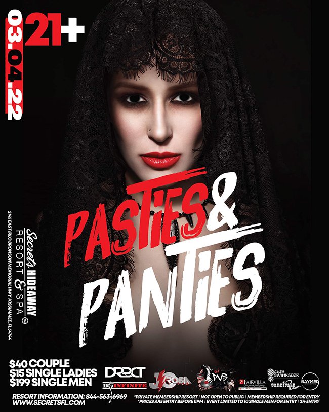 This Friday night at Secrets Hideaway™ we are starting the night off hot AF as our members are invited to find the perfect go-to outfit - panties and pasties! That’s right, there is no Lifestyle staple like a sexy pair of panties and dare-to-bare pasties. So, whether you dazzle and shine or find something naughtier, you can pack light this weekend at Secrets Hideaway™.