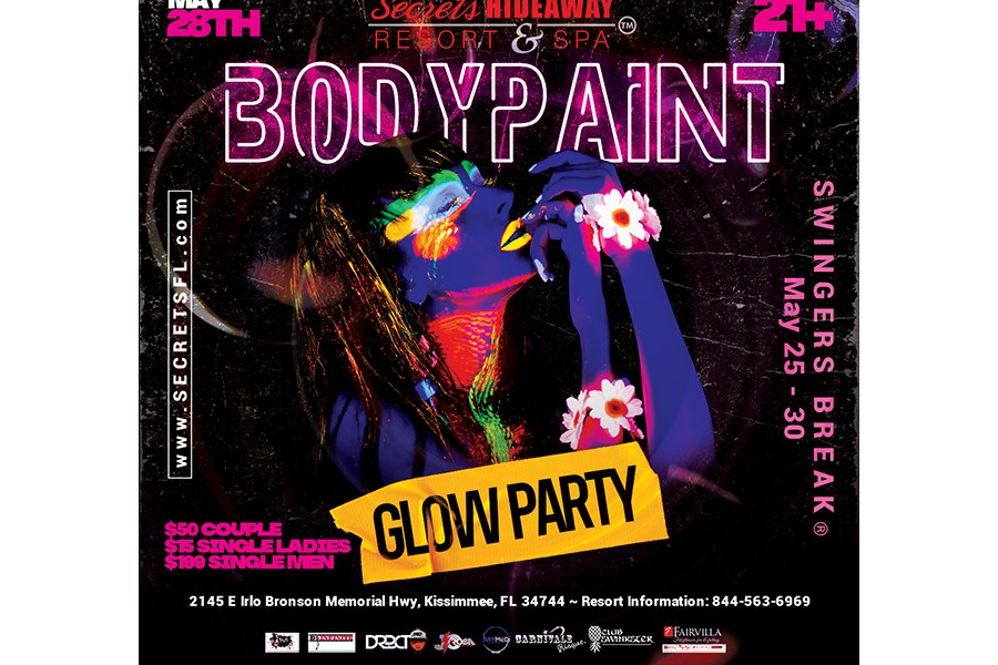 One of those most erotic sights is bare skin, glowing in the moonlight. Tonight, Secrets Hideaway™ recreates that fantasy with a Body Paint GLOW party you don’t want to miss! This is a unique party that fuses together music, special effects, and colors to amaze you. Step into a mind-blowing combination that creates interaction, excitement and enjoyment from start to finish. This spectacular party has a sexy impact on the crowd, as they go absolutely crazy!!!! We will have body painters on property for your convenience. The dance floor will transform into a luminescent sea of sensuality, as the DJ spins the hottest music, and the bartenders keep the drinks coming all night long. Reserve your VIP section inside Club Secret® by contacting Lexy at VIP@secretsfl.com.