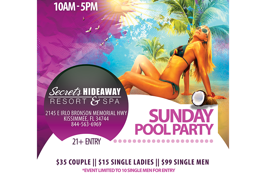 Let loose and spend the evening with us - reduced room rates on Sunday evenings make splurging on an extra day an epic way to end your sexiest weekends. With two tiki bars serving your favorite cocktails and a full lunch menu, you’ll have plenty to keep you fueled as you spend Sunday Funday at the sexiest clothing-optional pool party in Kissimmee!