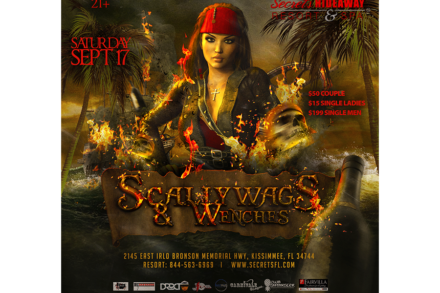 Ahoy Me Hearties! Join us if ye dare for a night of grub, grog, and dancing. All ye wenches and salty dogs, pillage and plunder away! Keep a weathered eye on the horizon, and chart ye course for Secrets Hideaway™ for some pirate fun.