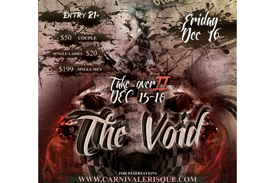 Carnivale Risque and Secrets Hideaway welcomes you to "THE VOID".  Come get lost or come get found with our Legendary Mentors Sir Tank & Goddess Ellez. Our devoted congregation will make sure you have a great time while you wait for your fate. Will it be Heaven, will it be Hell? Or the eternal darkness of the Void