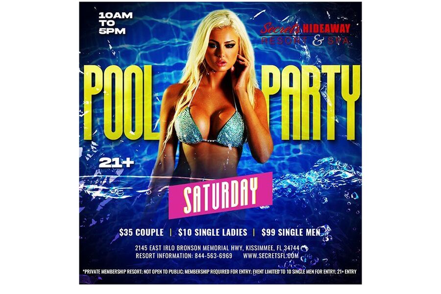 Celebrate Saturday in the sexiest way possible at Secrets Hideaway’s™ clothing-optional pool party! The weather is hot, so come strip down and cool off poolside. Join all of your sexiest friends at Secrets Hideaway Resort and Spa™ for a day in the sun, drink in hand, hot music, and even hotter friends. Our courtyard pool area and two outdoor tiki bars are the perfect location to let loose, be free, and celebrate summer!