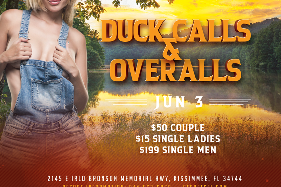 Tonight, Secrets Hideaway™ presents Duck Calls & Overalls. This event will take you down the back roads. Long, short, ripped, or tie dye, all overalls are welcomed at this party! Dress and prepare as if you're headed down a country road, you never know what to expect except the fact that it is likely going to get down and dirty.