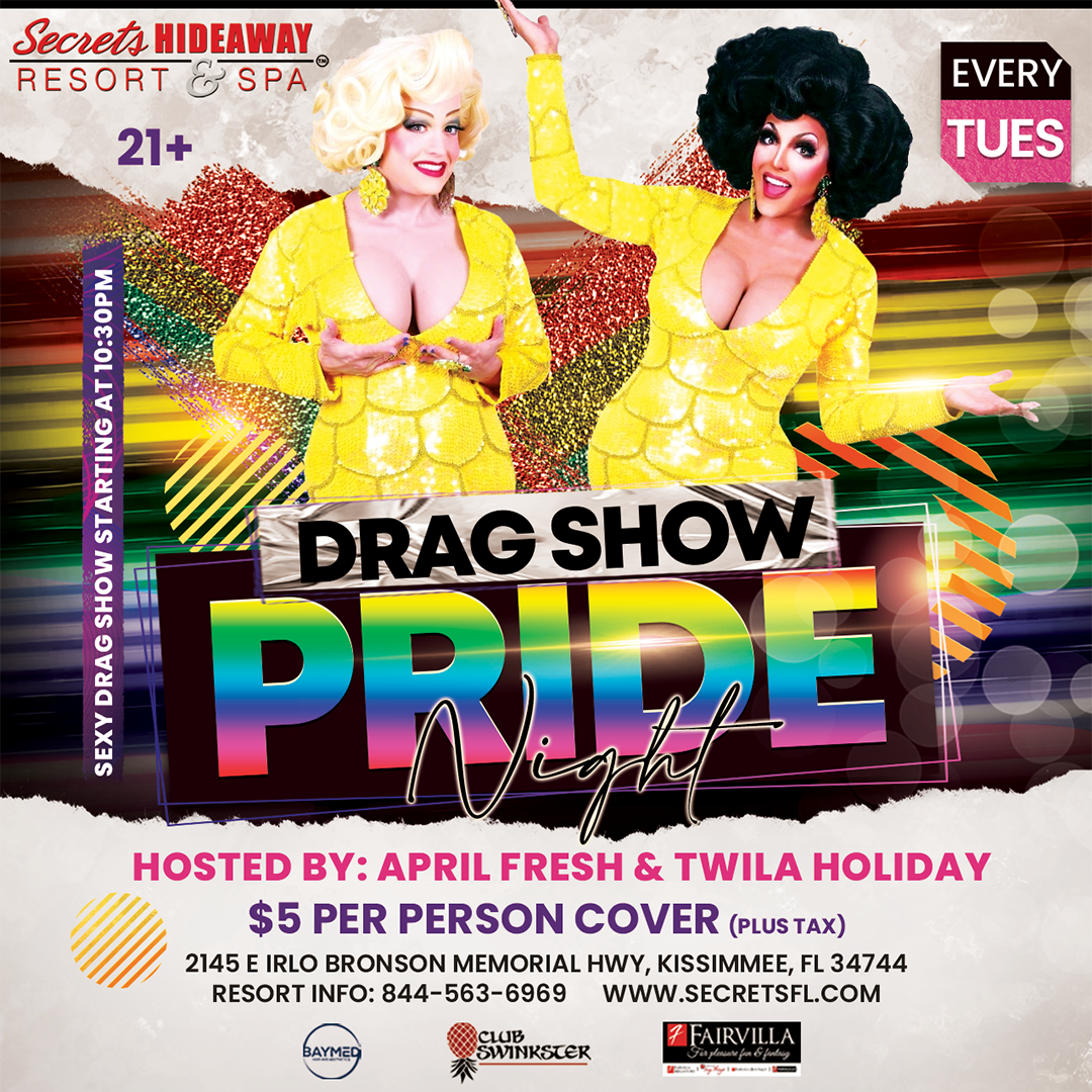 Every Tuesday is PRIDE TUESDAY. Join us and enjoy this electrically charged night with the stunningly energetic and beautiful performers with our super-hot Drag Show at 10:30pm. The night will be filled with erotic music, dancing, and our DJ will be spinning today’s top hits. We will have $5 Sex on the beach, $5 Long Island, $5 Blue Long Island, and $15 Corona Buckets all night long.