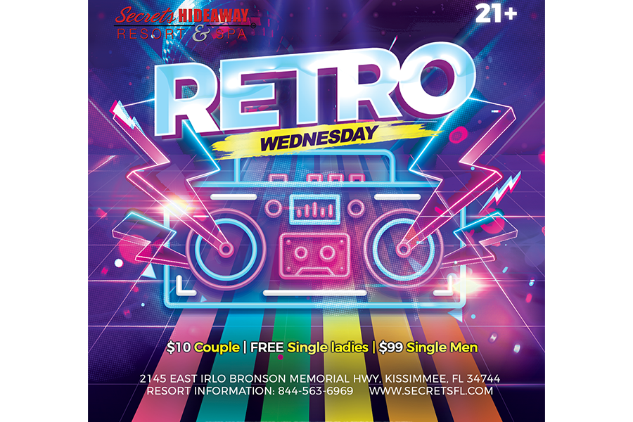 Every Wednesday night, Secrets Hideaway is going Retro! Join the Secrets Sexy Squad as they take it back to the 70s, 80s, 90s and early 2000s with Retro Wednesday. From 70s Disco & Funk, 80s Hair Bands, 90s Hip Hop to the early 2000s Electronica, relive your early years at Secrets Hideaway. These high energy dance styles come to Club Secret® as we celebrate all things retro every Wednesday!