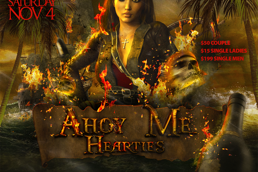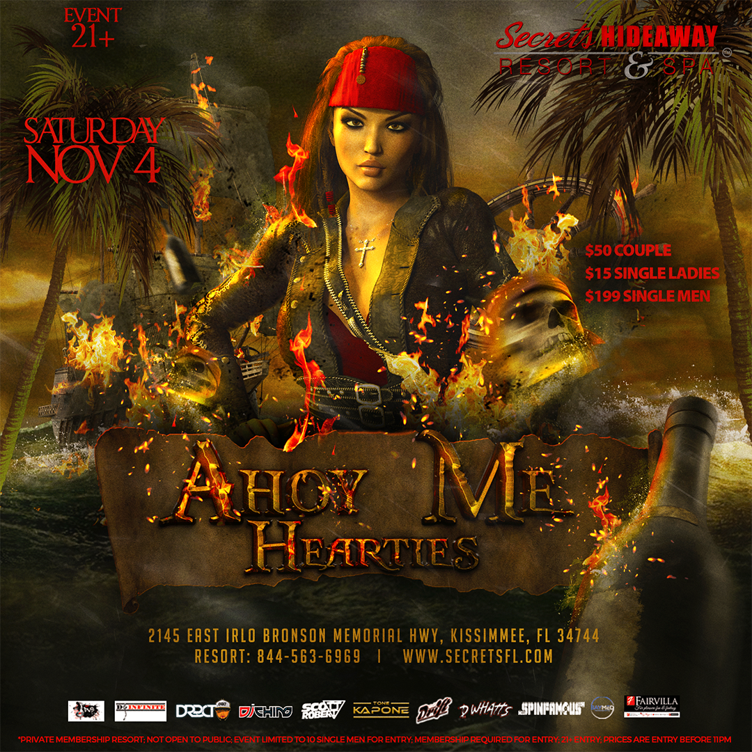 Ahoy Me Hearties! Join us if ye dare for a night of grub, grog, and dancing. All ye wenches and salty dogs, pillage and plunder away! Keep a weathered eye on the horizon, and chart ye course for Secrets Hideaway for some Pirate Party fun.