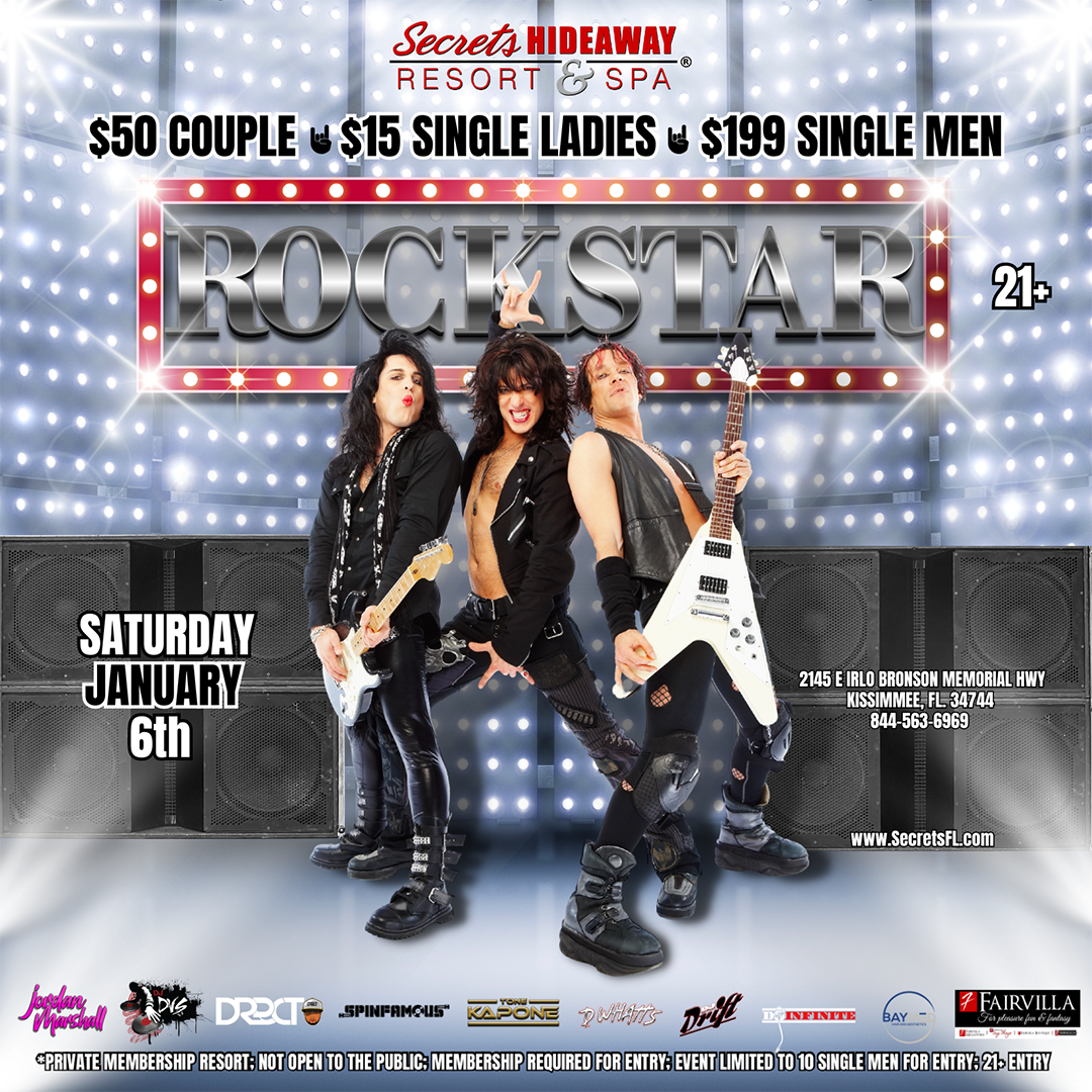 Tonight, get ready to stroke your alter ego and let your wildest fame and fortune fantasies come out to play - it’s time to party like a Rock Star at Secrets Hideaway Resort & Spa®! Break out your leather pants, spandex, and leopard print and indulge your inner demigod at Club Secret®! Join your sexiest friends on the dance floor, or show off your celebrity-style. Our plush VIP areas are the perfect place to tease your partner and indulge with your closest friends, so reserve yours now and party in pure luxury.