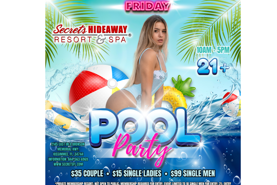 Kick off your weekend in style at the Friday Pool Party, an enticing affair hosted every Friday from 10 am to 5 pm at Secrets Hideaway Resort & Spa. Immerse yourself in the ultimate daytime indulgence as you join Orlando's most exhilarating clothing-optional pool party. From the moment the clock strikes 10 am, the party comes alive with refreshing cold drinks served at the lively tiki bar, a delectable lunch and dinner menu, and the infectious beats spun by our professional DJs, setting the perfect backdrop for a day of carefree fun and relaxation. At Secrets Hideaway, we offer not just a pool party but an experience where you can revel in the sun, enjoy tantalizing food and drinks, and groove to your favorite tunes, all in the company of friendly, open-minded individuals.