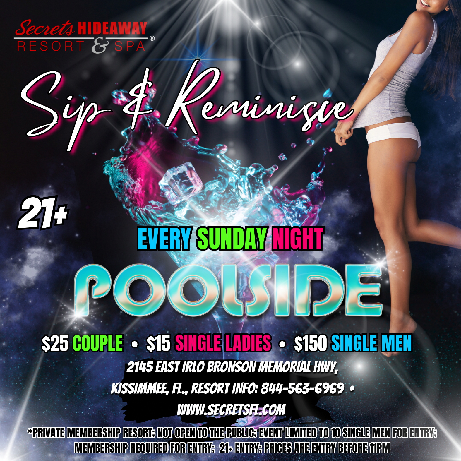 Extend the weekend bliss and dive into an evening of sheer indulgence at Sip & Reminisce Poolside, held every Sunday night at Secrets Hideaway. Gather your friends and let the fun continue as you embrace the laid-back ambiance of our clothing-optional oasis. Whether you prefer to dress to the nines or keep it casual, the choice is entirely yours at this liberating event. Picture yourself poolside, surrounded by the hottest beats, the iciest drinks, and the sexiest company. Sip & Reminisce offers more than just a relaxing evening by the pool; it's an invitation to free your inhibitions and explore your deepest desires in the company of like-minded friends.