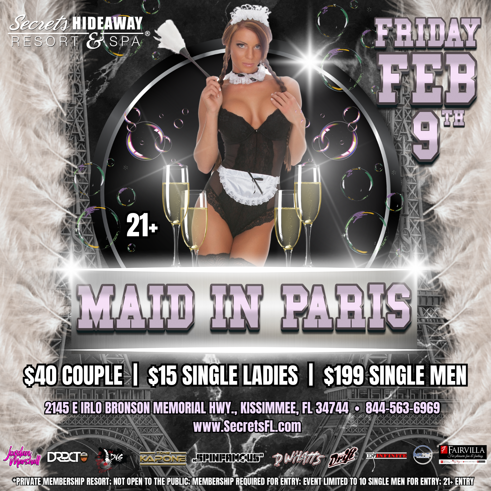 Tonight, Secrets Hideaway™ is going French. French Maid that is. Get ready for an evening of French-inspired glamour and elegance at our upcoming Maid in Paris party! This is the perfect opportunity for you to break out your best French maid outfits and enjoy a night of Parisian-inspired fun. Ooh La La. As they say in France, vous les vous coucher avec moi?