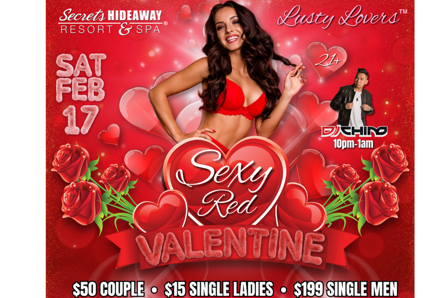 It’s the sexiest weekend of the year and Secrets Hideaway Resort and Spa™ is ready to celebrate sensuality with our Valentine’s Takeover! Secrets Hideaway™ is your secret Valentine’s escape, so stay the weekend and experience a signature sexiness like no other. Saturday night, the party will be Red-Hot, so dress to impress in your sexiest red attire! The party goes all night, with couple’s contests, sexy give-aways, and plenty of drinks from our two full-service bars. With a large dance floor, fully-equipped playrooms and more, get ready to experience pure ecstasy at the most sensual resort in the US!