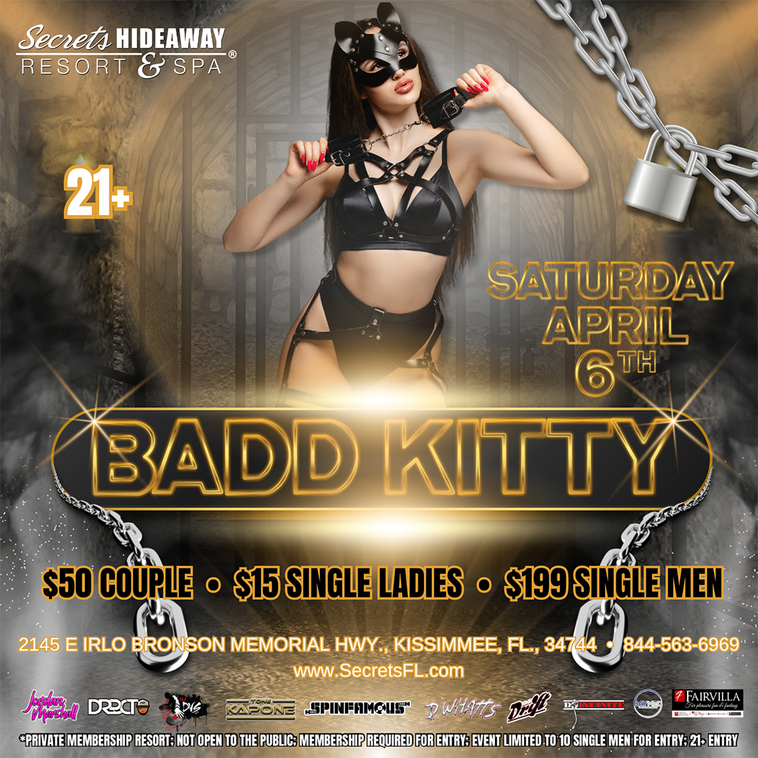Get ready to unleash your inner wild side and step into a world of glamour, mystery, and unbridled fun at the Badd Kitty Party, set to ignite Secrets Hideaway on April 6, 2024. This exclusive event promises an evening of sultry vibes, electrifying music, and an atmosphere pulsating with excitement. Join us for a night where inhibitions are left at the door, and attendees are encouraged to embrace their inner Badd Kitty.
