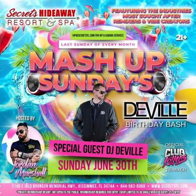 All the parties are located at Secrets Hideaway Resort & Spa®. For reservations: Visit our reservations page Click here for Reservations , call 844-563-6969 or book by clicking the Red "Book a Room" button at the top of each event page.