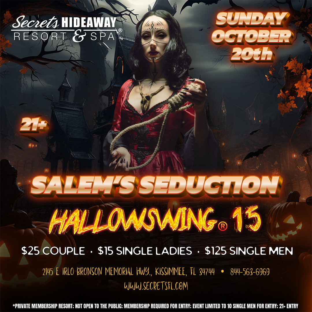 Hallowswing® 15 at Secrets Hideaway continues its immersive experience with the bewitching event, "Salem's Seduction," scheduled for Sunday, October 20th. join the alluring call of the Coven, you are invited to join their ranks and delve into the mystical world of witchcraft. Tonight is the night of enchantment, with an emphasis on a violent struggle from within as as the Salem witches seek to bend the will of those who dare to step into their realm.