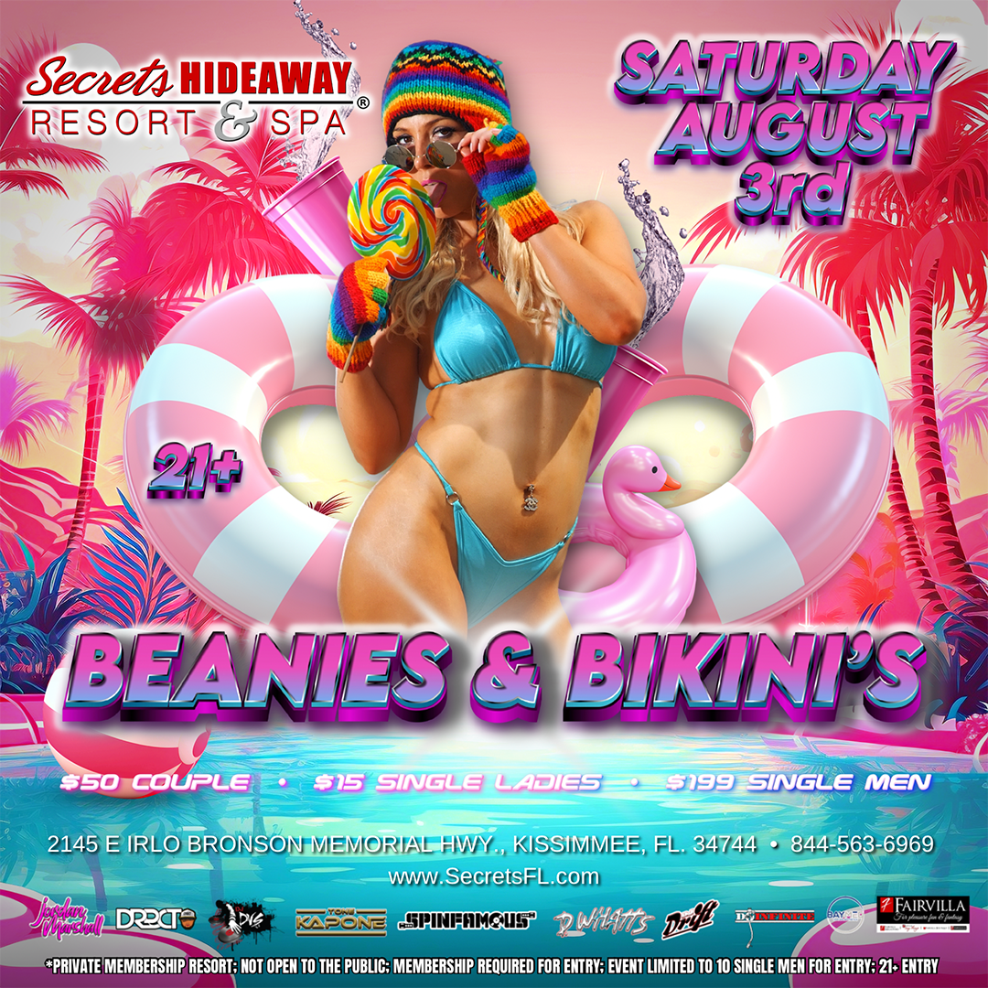 As we into a playground of seduction, "Beanies & Bikinis" encourages you to revel in the freedom of self-expression and celebrate the diversity of beauty. From the vibrant poolside scene to the enticing dance floor, this event is a vibrant fusion of sexy bodies, tiny bikinis, and the carefree spirit of summer. Join us on August 3rd for a day and night of uninhibited fun, where beanies meet bikinis, and Secrets Hideaway becomes the epicenter of a scorching summer celebration that's bound to leave a lasting impression.