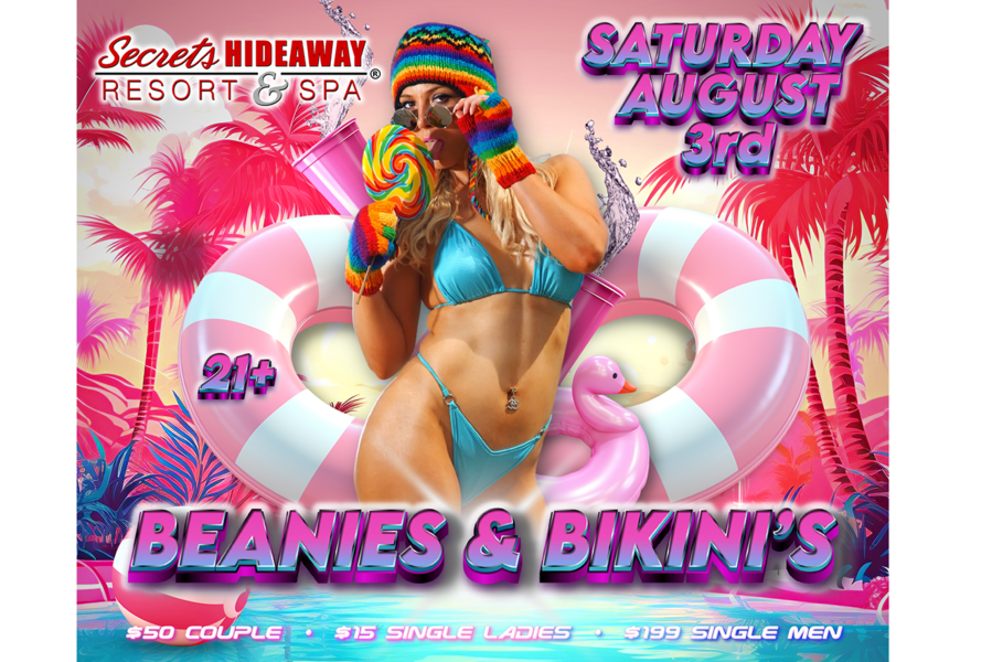 Prepare for a sizzling summer spectacle at Secrets Hideaway's "Beanies & Bikinis" event on August 3rd. This scintillating affair invites guests to showcase their beautiful assets as they don their sexiest bikinis and pair them with stylish beanies, creating an irresistible combination of beach chic and urban cool. Whether you're flaunting your curves by the pool or grooving to the beats on the dance floor, this event promises an electrifying atmosphere where the summer heat meets the allure of open-minded exploration.