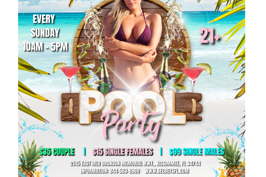 Sundays have never been more liberating! Join us every Sunday from 10 am to 5 pm for the ultimate relaxation and rejuvenation at Secrets Hideaway's Sunday Pool Party. Whether you're extending the weekend fun with Sunday Funday or winding down from a wild adventure, this day is tailored for pure bliss under the warm Florida sun. Forget about swimsuits – at this clothing-optional paradise, come as you are and stretch out in one of our two inviting pools, letting the radiant sunshine kiss your skin as you bask in complete relaxation. Our bubbling hot tubs offer a soothing escape, and the conversation pool provides the ideal setting to make new friends, sparking conversations that linger with the promise of exciting connections.