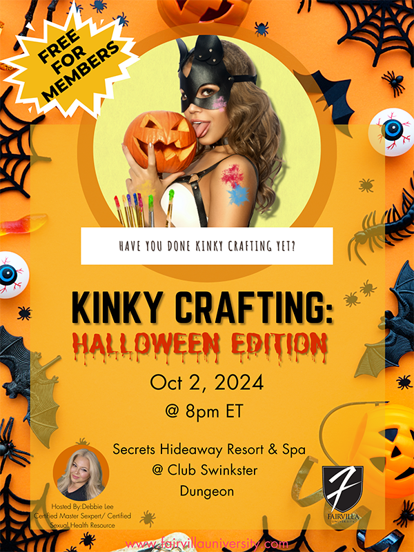 Join Fairvilla® for this Interactive class inside Club Swinkster™ tonight at 8pm for a special Kinky Crafting Halloween edition. Hosted by the one and only Debbie Lee. Get ready for a night where creativity meets sensuality, as we dive into the art of kinky crafting with a spooky, seductive twist.