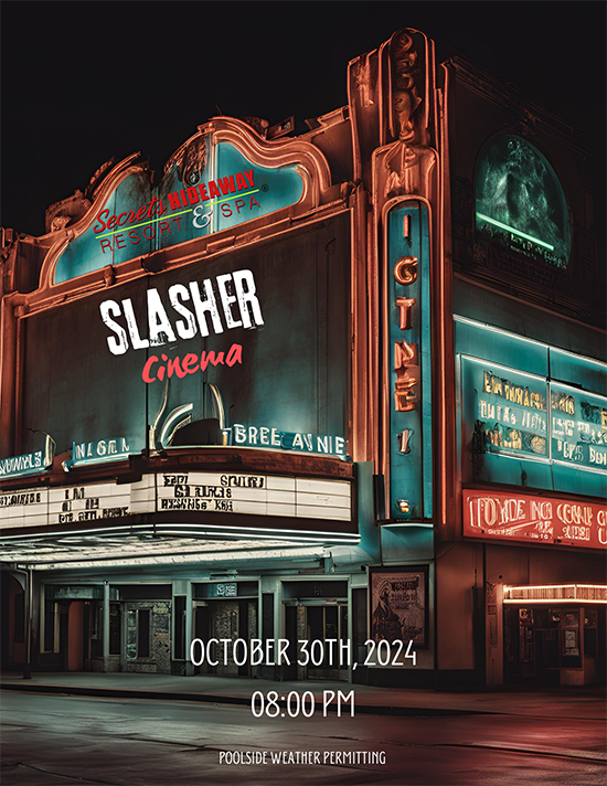 Join us poolside tonight at 8pm for "Slasher Cinema"—a bone-chilling horror movie experience that will get you into the Halloween spirit! As the night falls, the tension rises as we screen a terrifying slasher film under the stars. Whether you’re a fan of jump scares, creepy villains, or just love the thrill of horror, this is the perfect way to set the spooky mood for the season. Grab your drinks, a comfy seat, and prepare for a night full of screams and suspense.