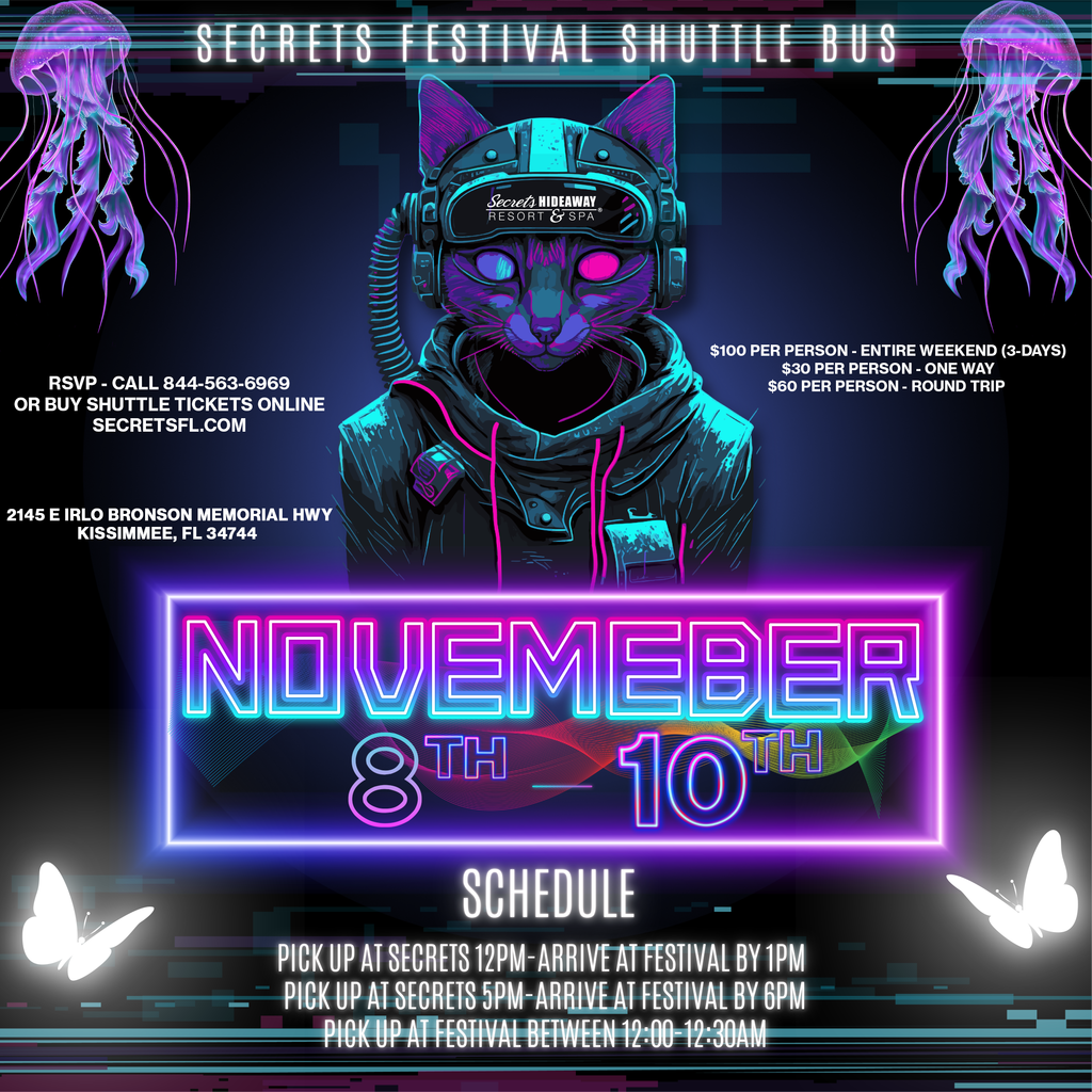 All the parties are located at Secrets Hideaway Resort & Spa®. For reservations: Visit our reservations page Click here for Reservations , call 844-563-6969 or book by clicking the Red "Book a Room" button at the top of each event page.